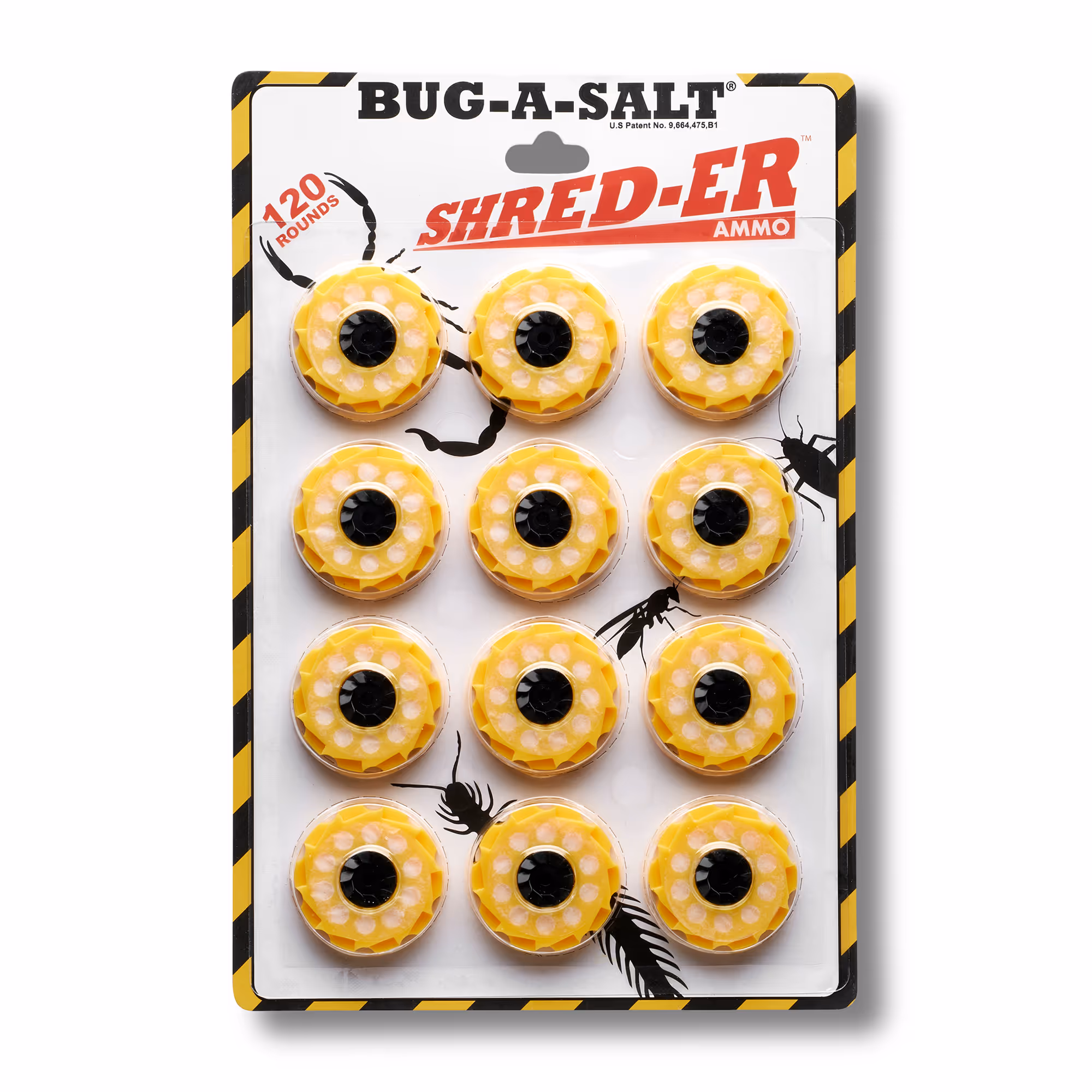 BUG-A-SALT SHRED-ER SALT CARTRIDGES Patented salt ammo for SHRED-ER blasters only. 12 cartridges = 120 shots. Non-toxic sodium rounds; please recycle after use.