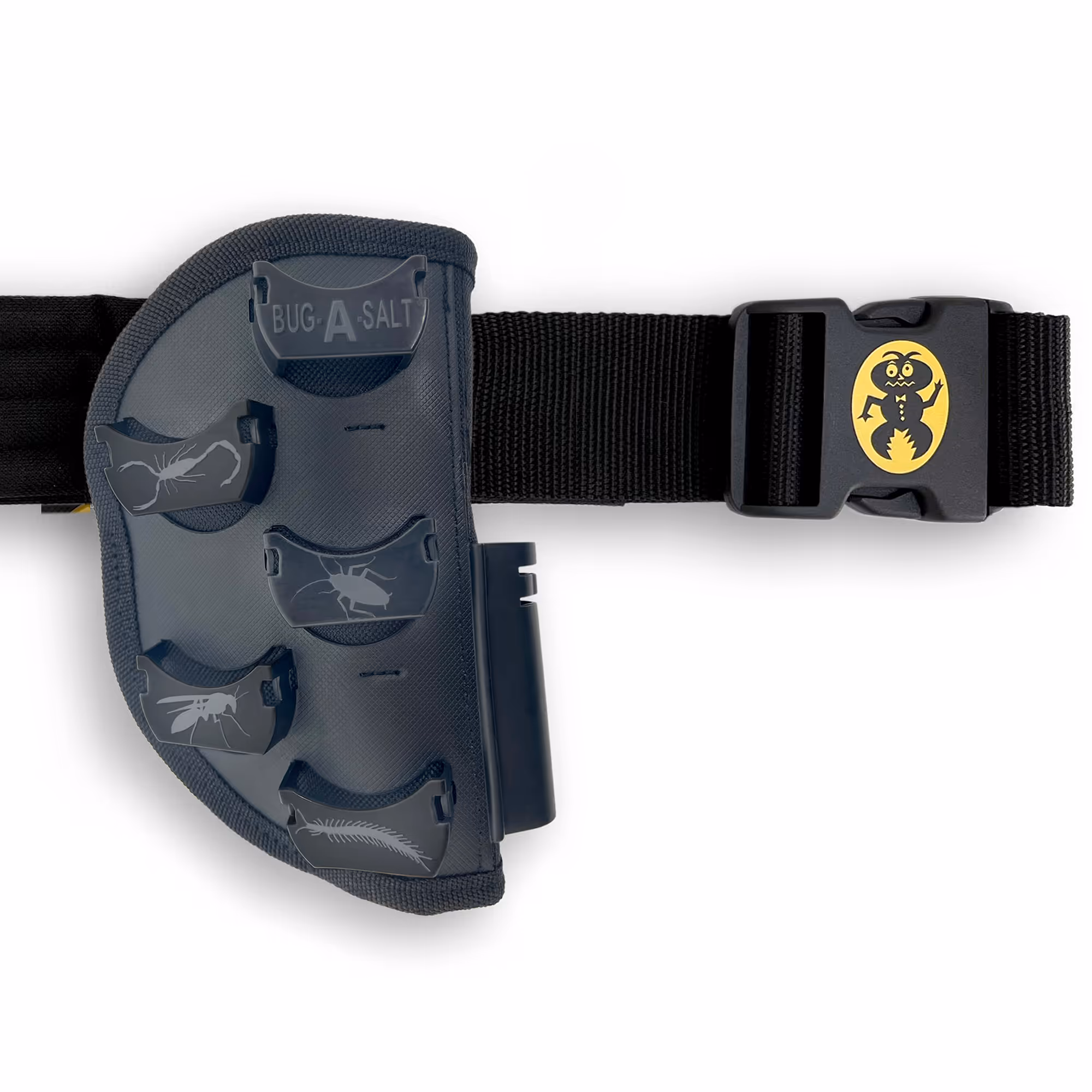 BUG-A-SALT SHRED-ER HOLSTER & BELT COMBO Western-style holster for the SHRED-ER. Holds 5 cartridges + 1 CO₂ canister. 2” belt width, 54” length, OWB right-hand draw.
