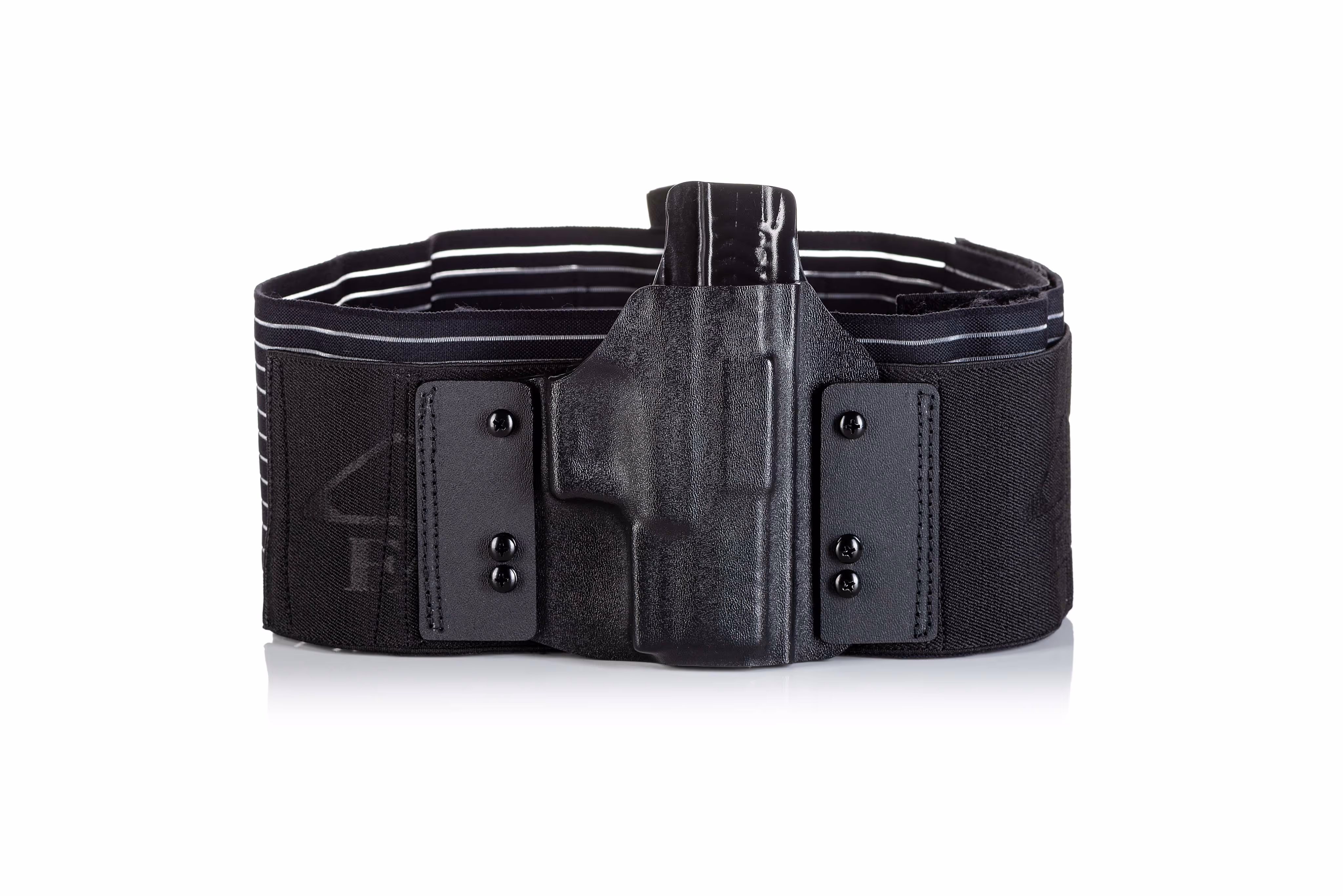 B106 – Kydex Belly Band Holster: Slim, belt-free design for appendix carry. Features a molded Kydex insert for trigger protection, breathable elastic, and extra magazine pouches.