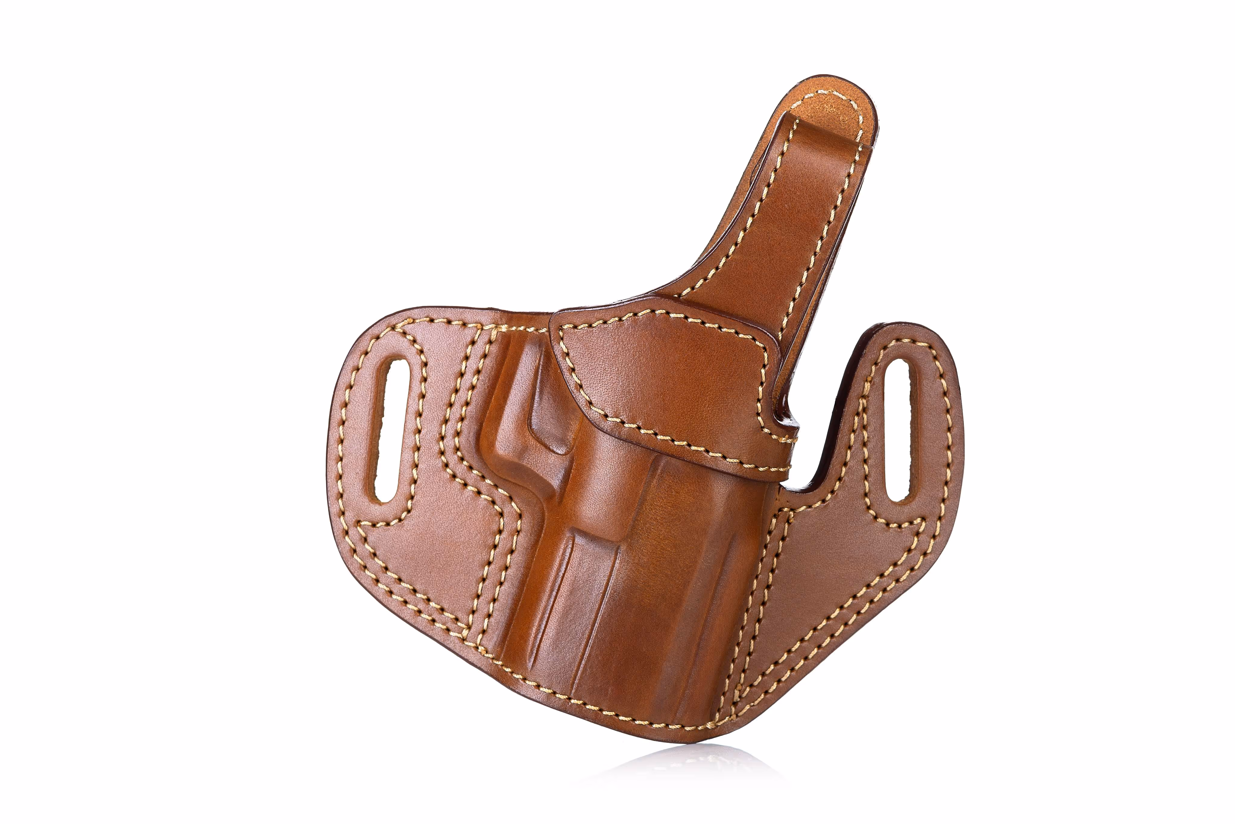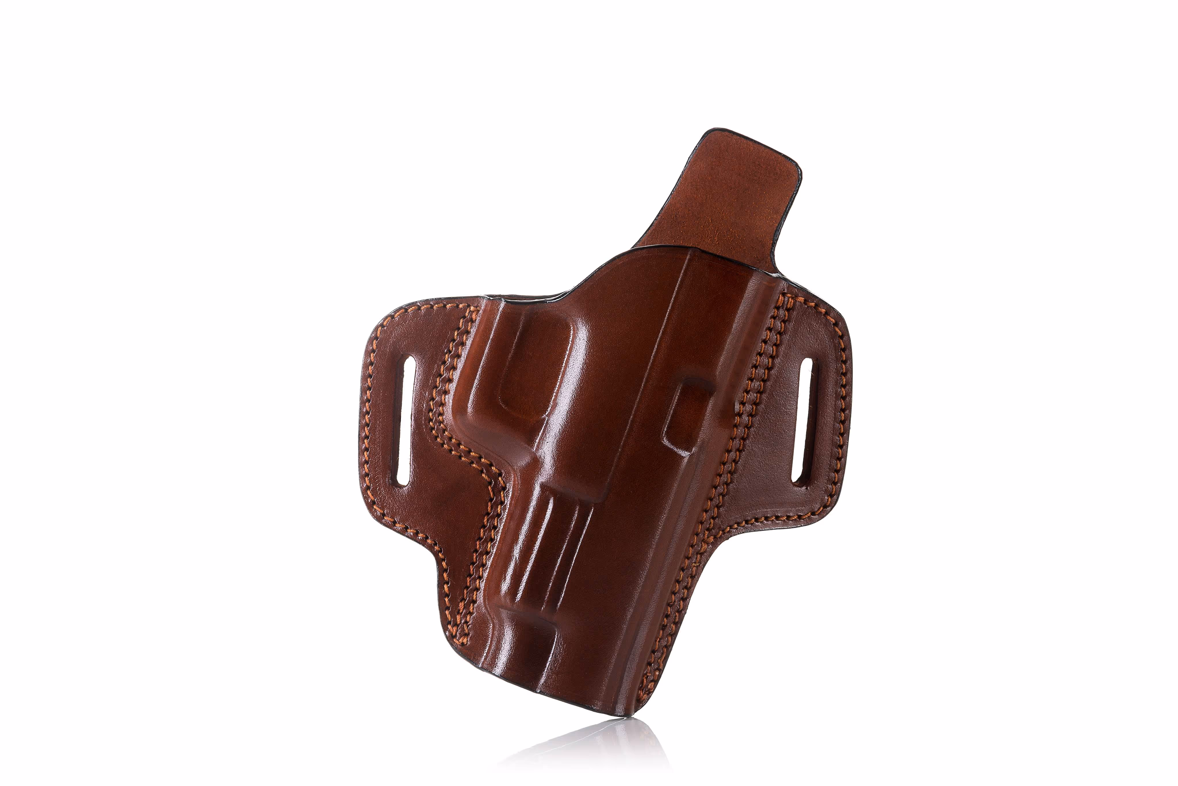 C631 – Multi-Fit Leather OWB Holster: Full-grain leather holster with steel thumb break, forward cant, and optics-ready fit. Designed for multiple pistols and all-day comfort.