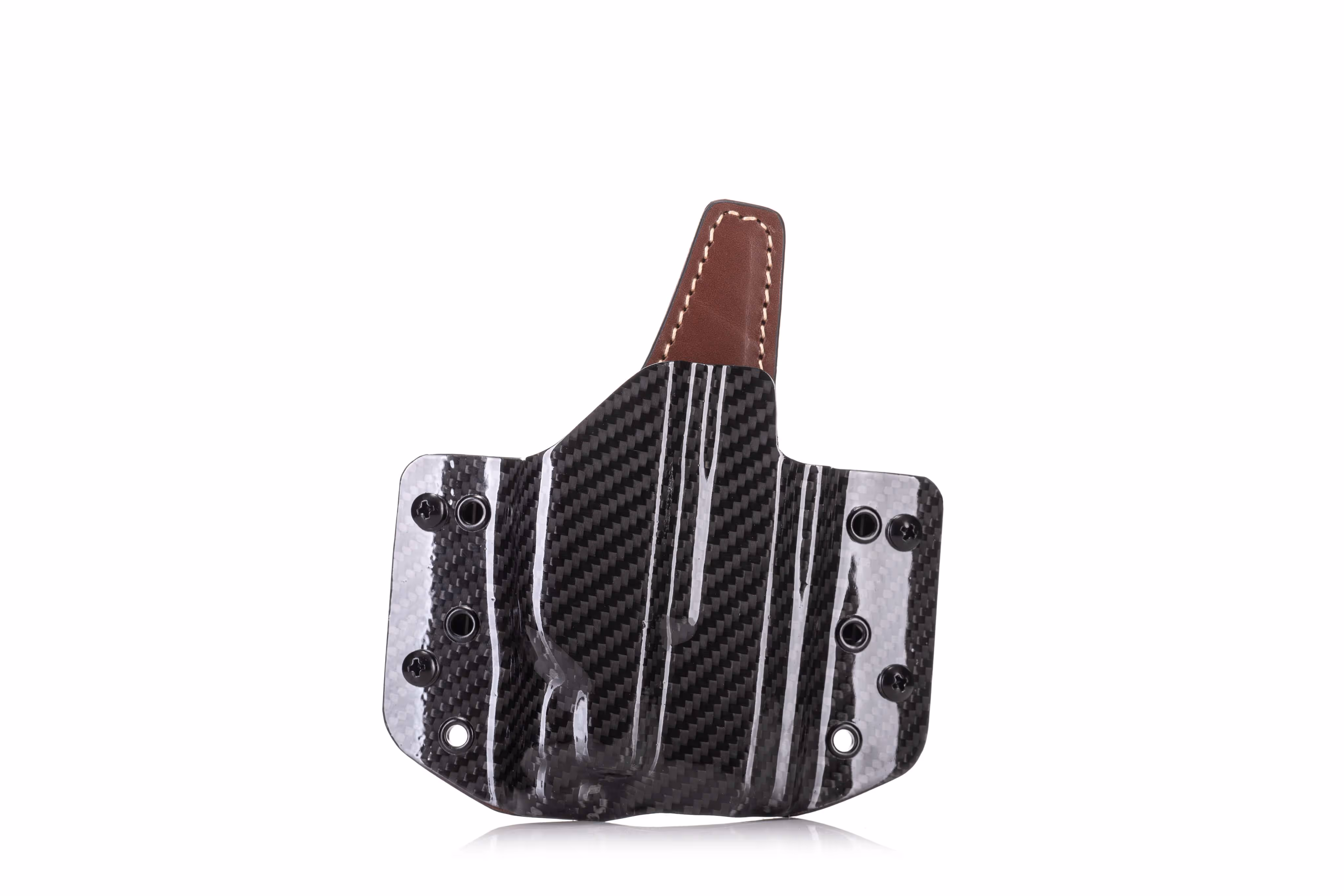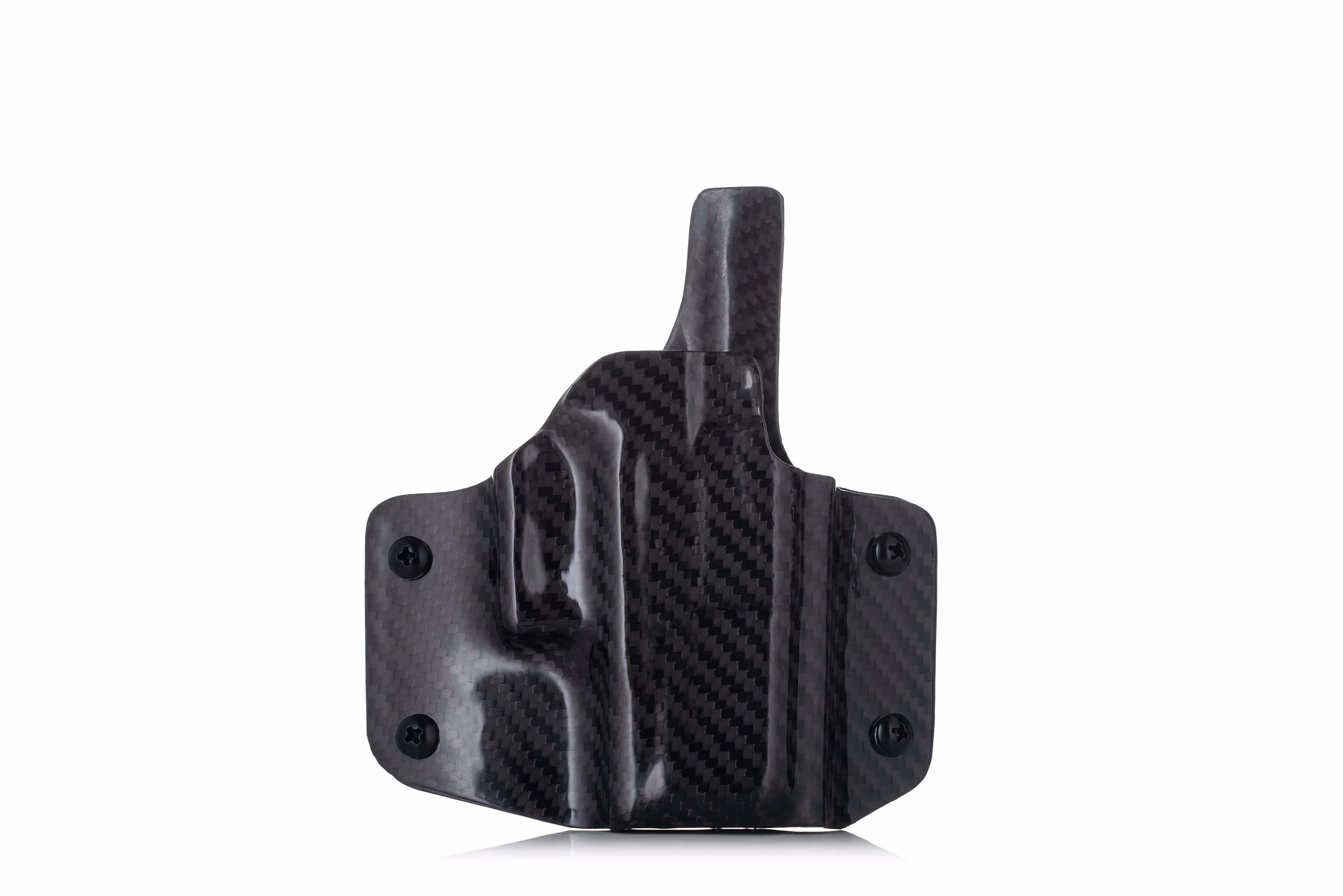 CX91 – Carbon Fiber OWB Holster: Crafted from genuine carbon fiber for extreme strength and light weight. Open-top and open-bottom design for quick draw and threaded barrels. RDS-ready with optional sweat guard.
