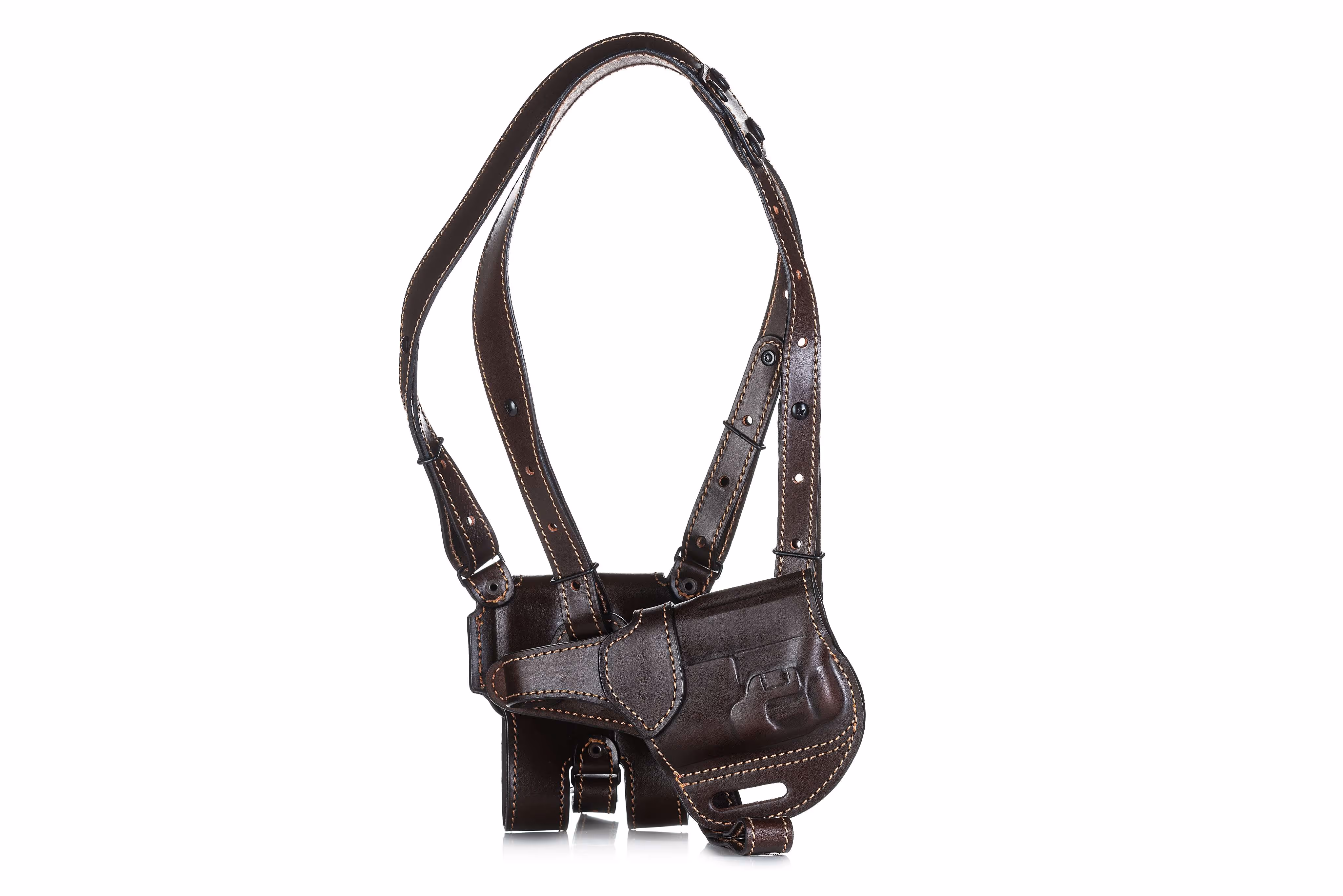 D109 FORESTER – Leather Chest Holster: Premium chest holster with adjustable harness and detachable pouch. Offers forefinger security strap for safe carry and custom fit for both pistols and revolvers.