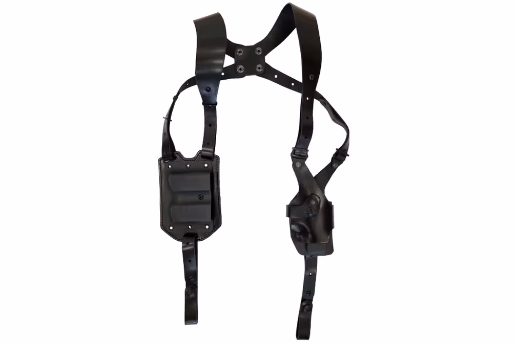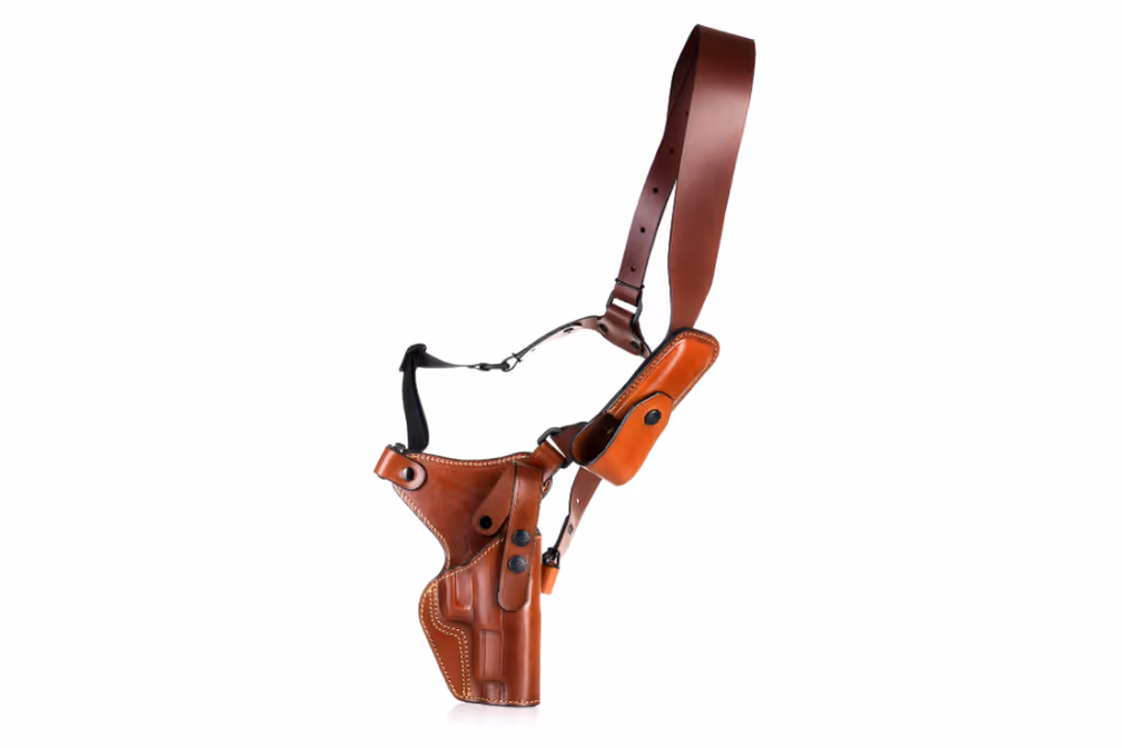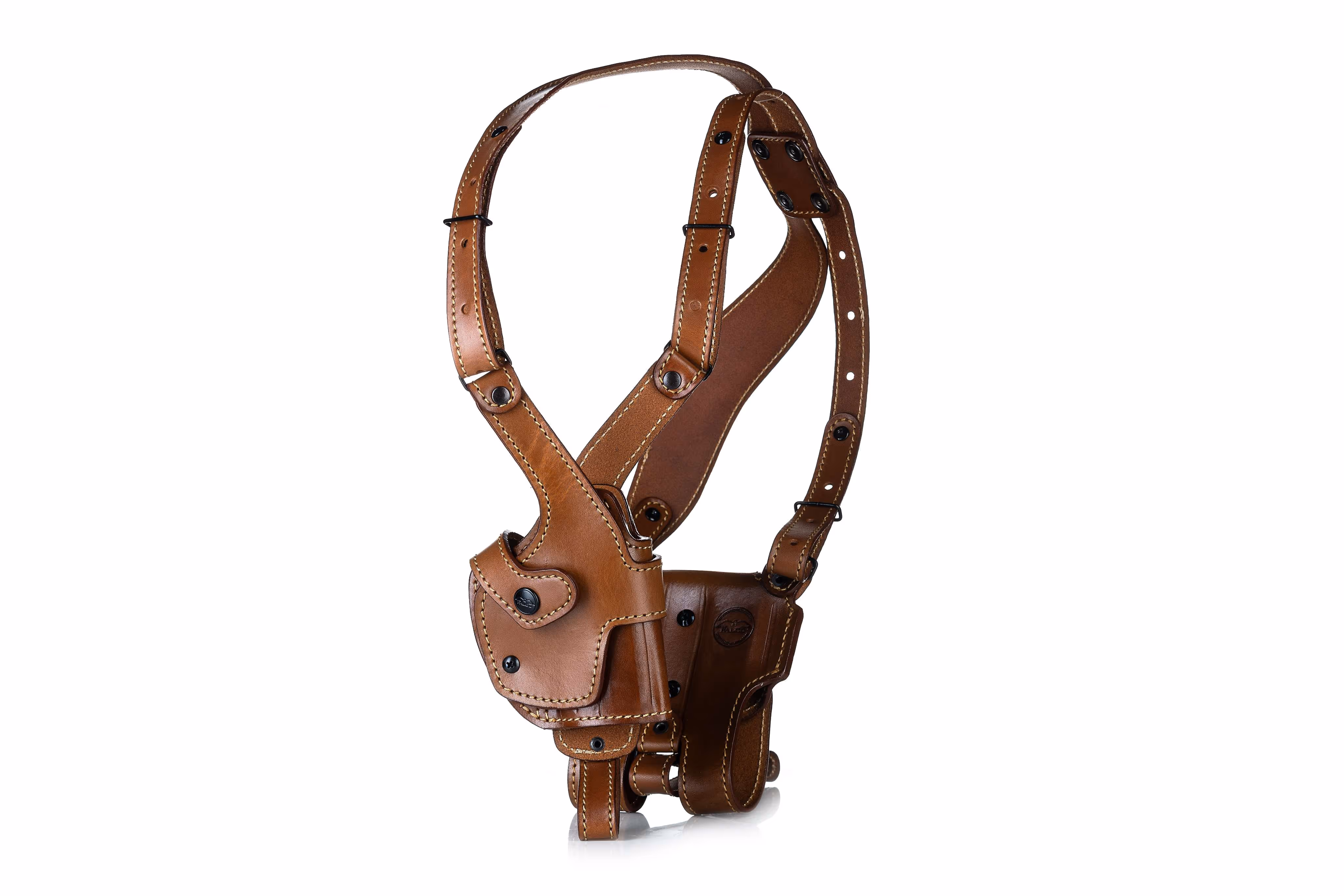 D632 L CARROLL –Leather Shoulder Holster with Counterbalance: Convertible leather shoulder holster with reinforced thumb break, dual magazine counterbalance, and OWB option. Optics and light compatible, built from premium Italian leather.