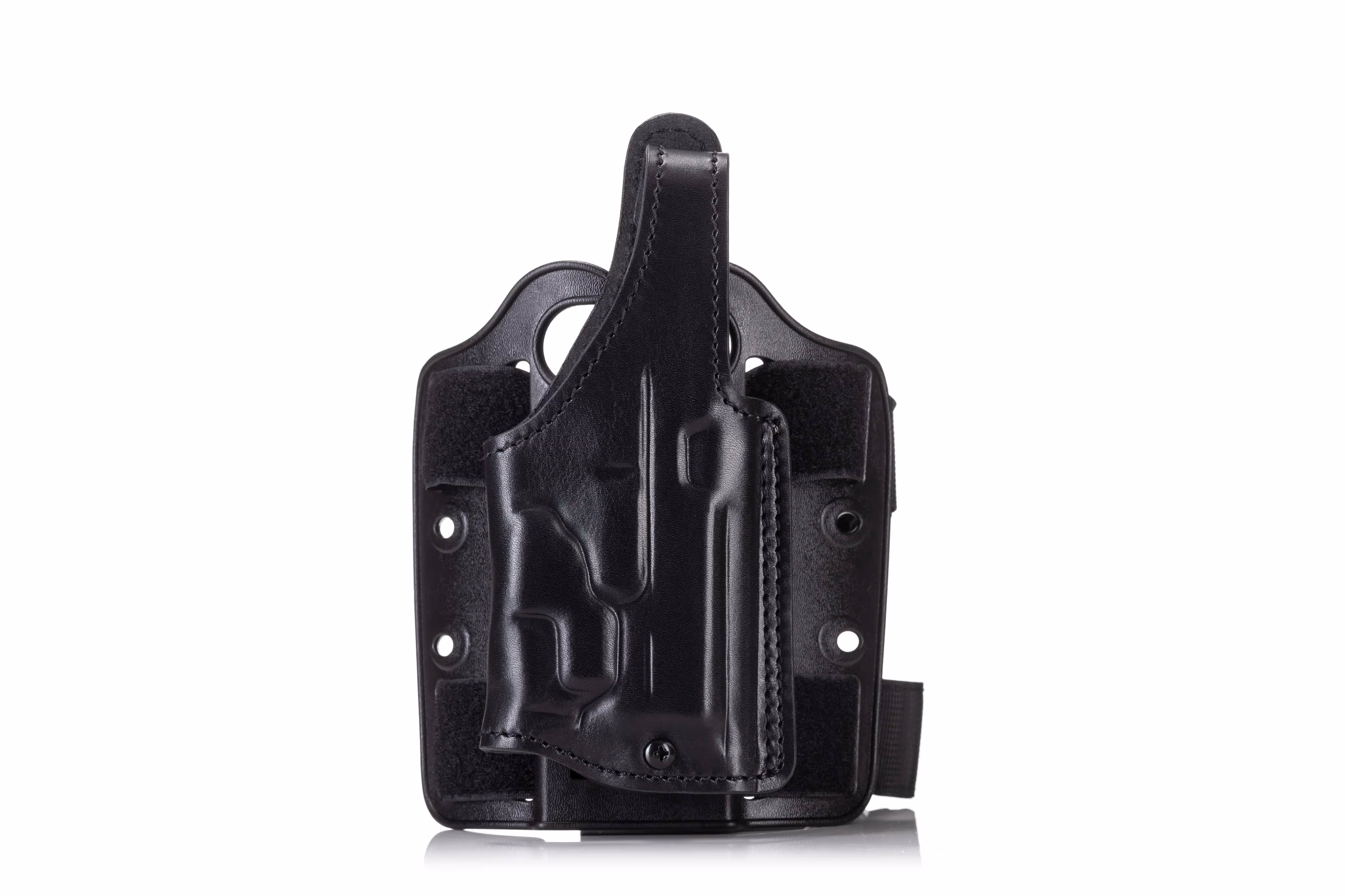 H201 – Professional Leather Duty Holster: Premium leather duty holster with lowered platform and thumb-break strap, built for law enforcement reliability.