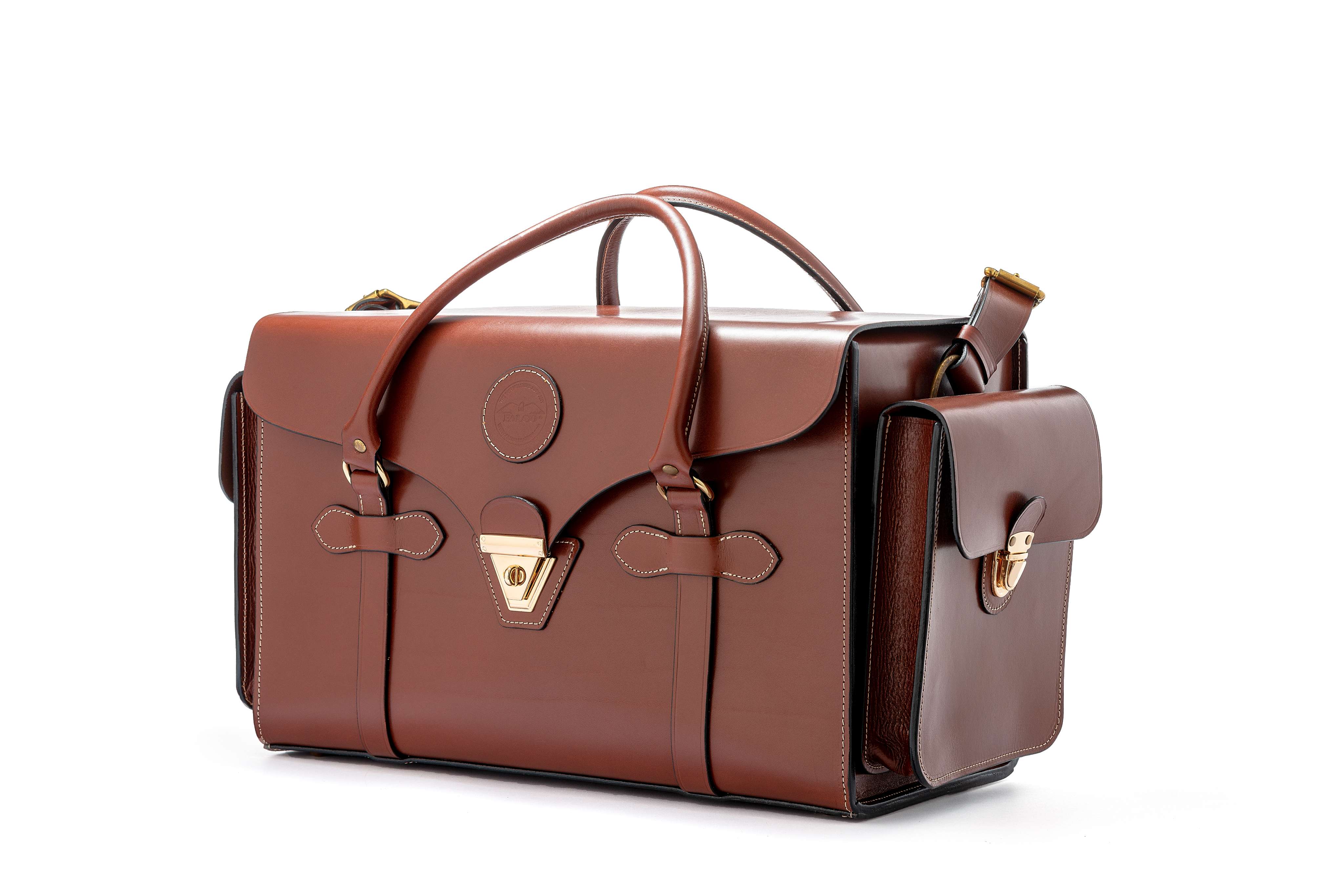 M102 – Premium Leather Range Bag: Elegant Italian leather bag with roomy main compartment and detachable side pockets for travel or range gear.