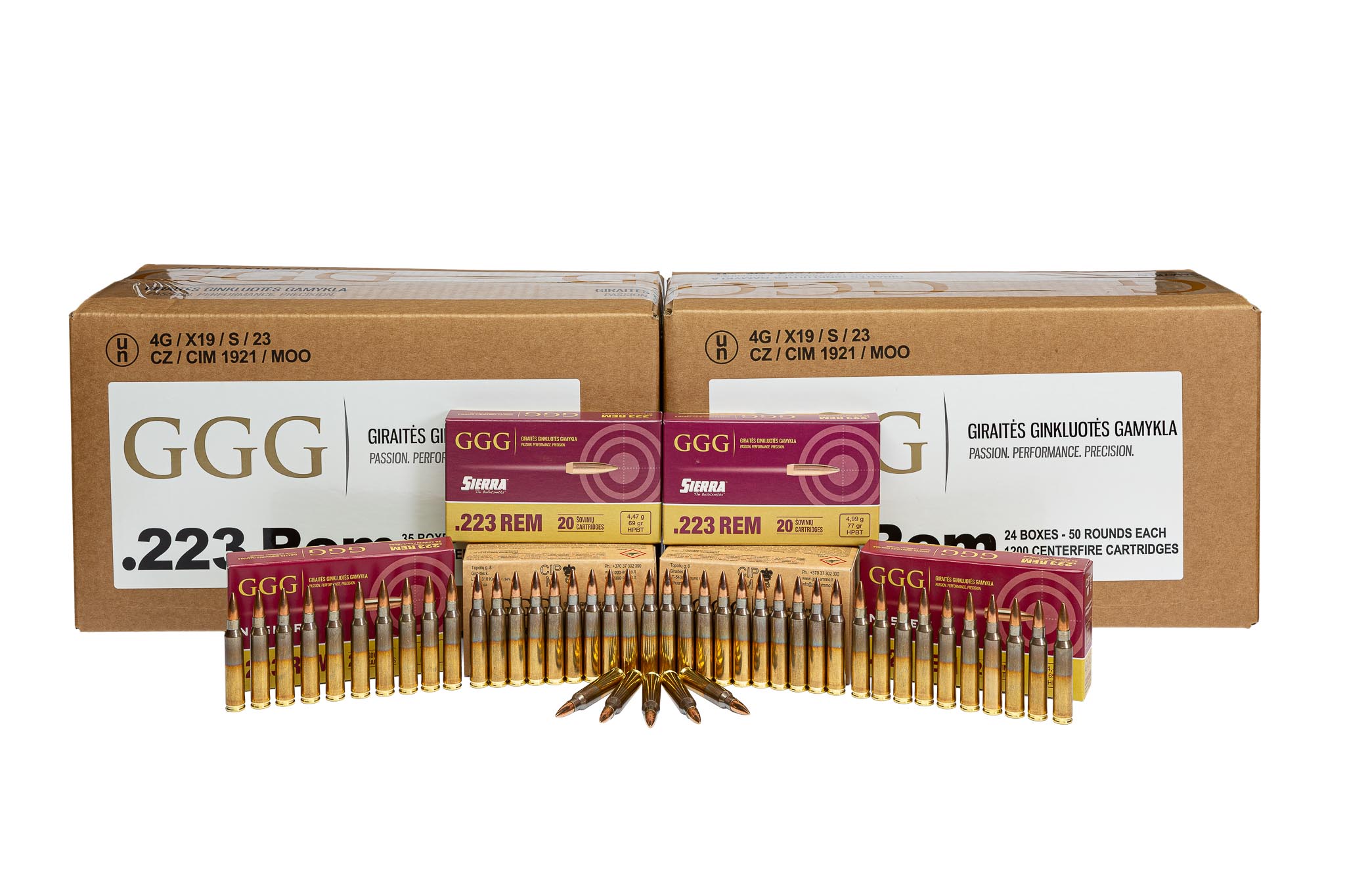 GGG .223 REM Cartridges: These are designed for hunting, practical shooting, and precision shooting. They are manufactured with different types of bullets, including GGG FMJ and Sierra HPBT MatchKing. For target shooting: GGG FMJ (55 gr / 3.56 g and 62 gr / 4.0 g). For hunting and target shooting: Sierra HPBT MatchKing (69 gr / 4.47 g and 77 gr / 4.99 g)
