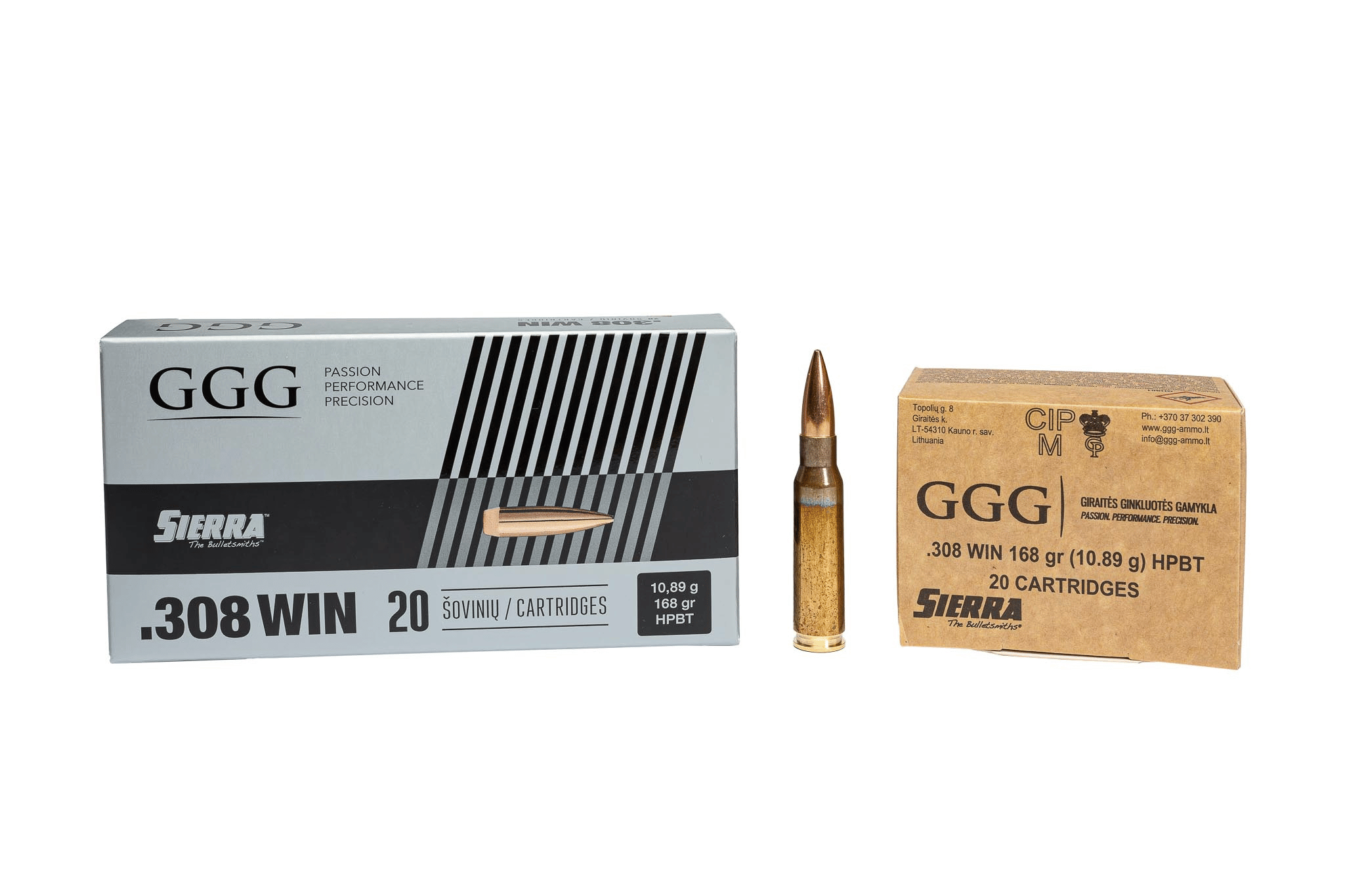 GGG .308 WIN Cartridges: These are also created for hunters, practical shooting, and precision shooting. They are manufactured with GGG FMJ, Sierra HPBT MatchKing, and Sierra SBT GameKing bullets. For target shooting: GGG FMJ (147 gr / 9.55 g). For hunting and target shooting: Sierra HPBT MatchKing (155 gr / 10.04 g, 168 gr / 10.89 g, 175 gr / 11.34 g, and 190 gr / 12.31 g). For hunting: Sierra SBT GameKing (165 gr / 10.69g % 180gr / 11.66g)