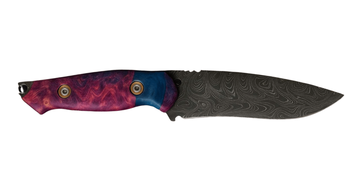 A Damascus steel masterpiece with elegant stabilized wood handle, blending strength, heritage, and fine craftsmanship.