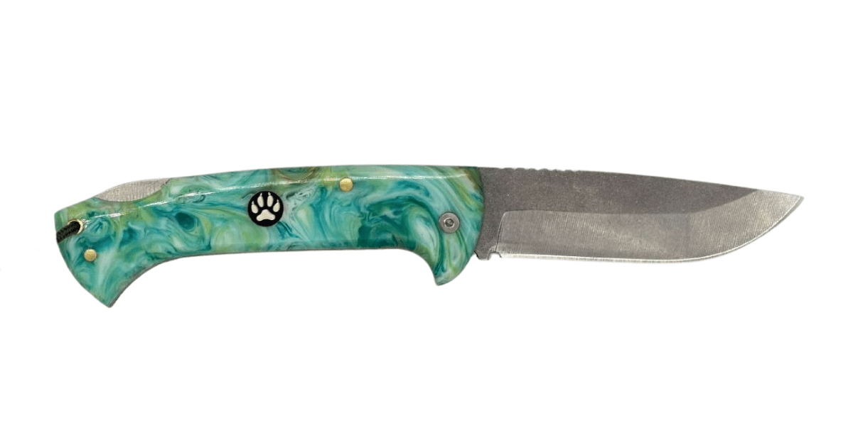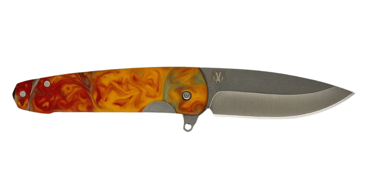 Vibrant epoxy handle and N690 steel blade — lightweight, precise, and full of personality.